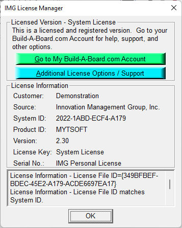 When properly Licensed with an IMG Personal License, a screen similar to this will show the License Information for the product. This display indicates that the software is Licensed. For help, support, and other options, you can click on the "Go to My Build-A-Board.com Account" to open a browser and access your account online.