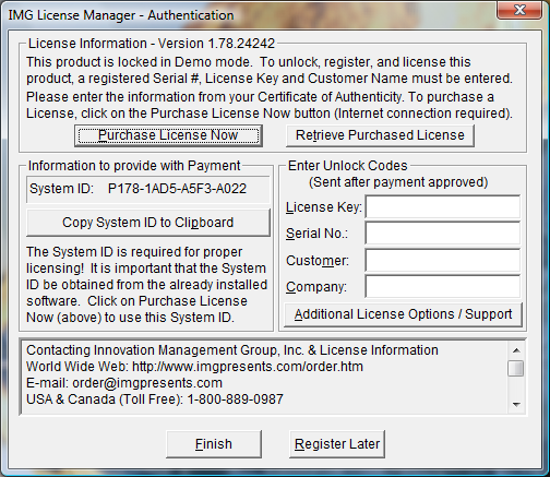 To quickly and easily license the software (on a system that has internet access), simply click on the "Purchase License Now" button. Once connected to IMG's website, you will be asked to enter billing information and payment information. Once paid, your order will be processed, and you will receive a confirmation e-mail and a separate e-mail with license information. Once the order is fully processed, you can then click the "Retrieve Purchased License" button to automatically license your system.