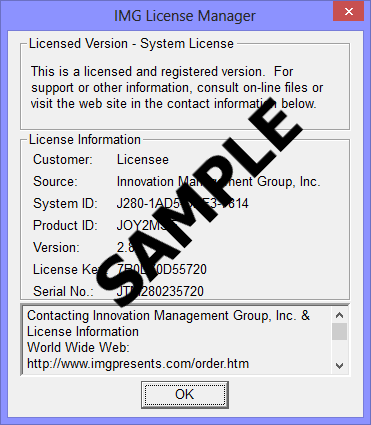 Technical Note: Professional / Support Licenses are licensed per product and the LICENSE.LIC file is located in the installation folder. The IMG Personal License is a System License, and the LICENSE.LIC is located in the Common Files area of Program Files in the Innovation Management Group License Manager folder.